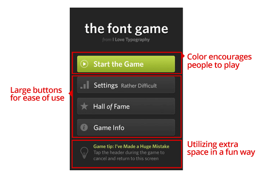사용자에게 정말 필요한 기능만을 중점적으로 제공함으로 사용자의 앱 사용 패턴을 단순화 해야 합니다. “The font game”이란 모바일 앱은 모바일에 최적화 된 디자인 예입니다. 굉장히 큰 버튼과 눈에 띄는 버튼(CTA), 그리고 핵심 기능만을 메인에 배치함으로 모바일 환경을 고려해 제작된 앱이라 볼 수 있습니다.