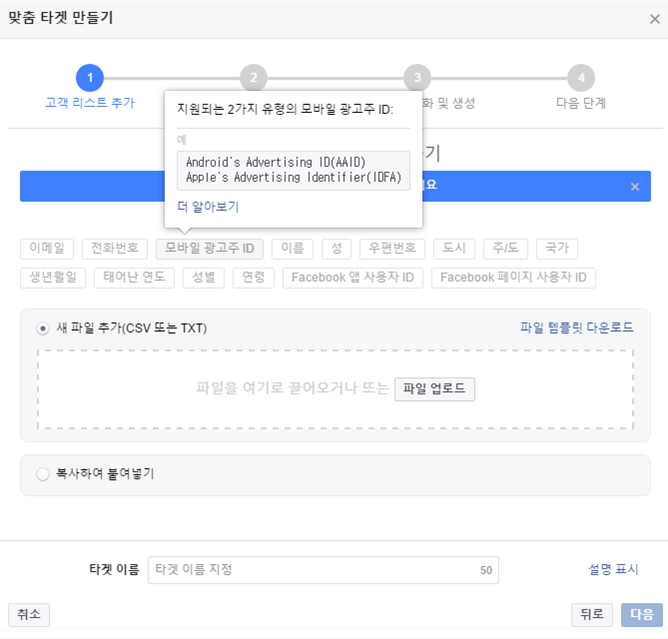 ( 페이스북의 ‘맞춤 타겟’ 옵션. 광고주가 원하는 특정 모바일 사용자만을 타겟팅 할 수 있도록 ‘모바일 광고주 ID’ 업로드가 가능합니다. 와이즈트래커로 추출할 수 있는 것이 바로 이 ID입니다.)