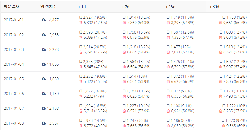 각 날짜별로 앱을 설치한 사용자 그룹을 대상으로, 1일, 7일, 15일, 30일 뒤 앱 재사용수와 앱 삭제수를 Retention 리포트를 통해 한 눈에 파악할 수 있습니다. 위 서비스의 경우 앱 설치 하루 뒤에는 평균 47%, 30일 후에는 평균 67%의 앱 삭제율을 기록하고 있습니다.