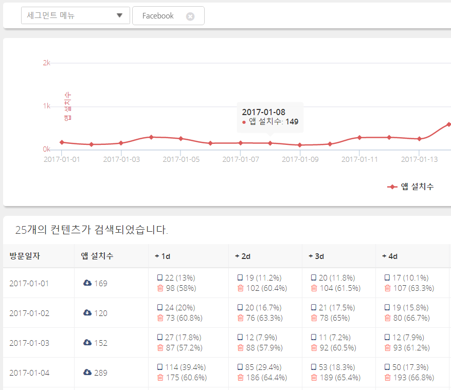 (페이스북 채널을 통해 앱을 설치한 사용자들의 앱 재사용/삭제수 리포트)