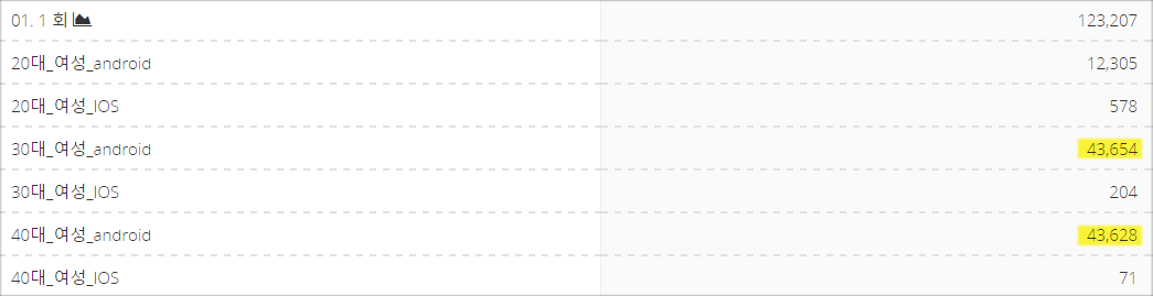 이를 통해 단순히 신규방문/재방문의 수치/비율 뿐 아니라, 각 방문 유형별 연령대 구성을 파악할 수 있습니다. 이 데이터를 통해 처음방문자의 경우, 20대와 30대의 수치가 비슷하게 나타나지만 반복방문자의 경우 30대의 비율이 20대보다 훨씬 높게 나타나, 앱 서비스가 20대보다 30대에게 지속적으로 어필되고 있다는 것을 확인할 수 있습니다.