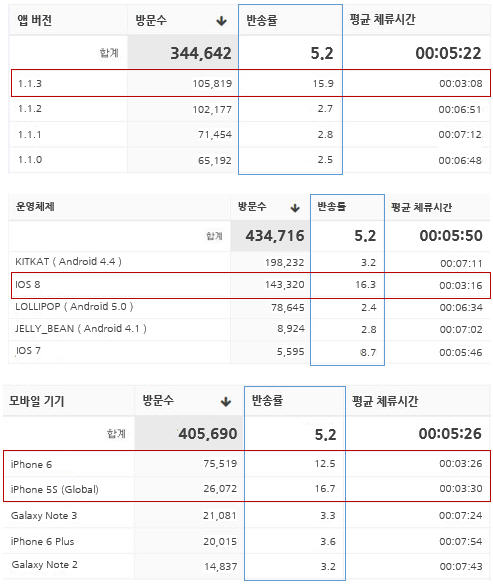 위와 유사한 행위가 자주 반복된다면 반송률은 증가할 수 있습니다. 즉, 반송률은 앱의 부정적 컨디션을 확인할 수 있는 유일한 지표라고 볼 수 있는데요, 이 지표는 주로 시스템 관련 디멘젼과 어울려 제공됩니다. 앱을 업데이트 했는데 문제는 없는지. 특정 OS에서 또는 특정 디바이스에서 에러가 발생하지 않는지 등을 반송률 지표를 통해 추정할 수 있습니다.