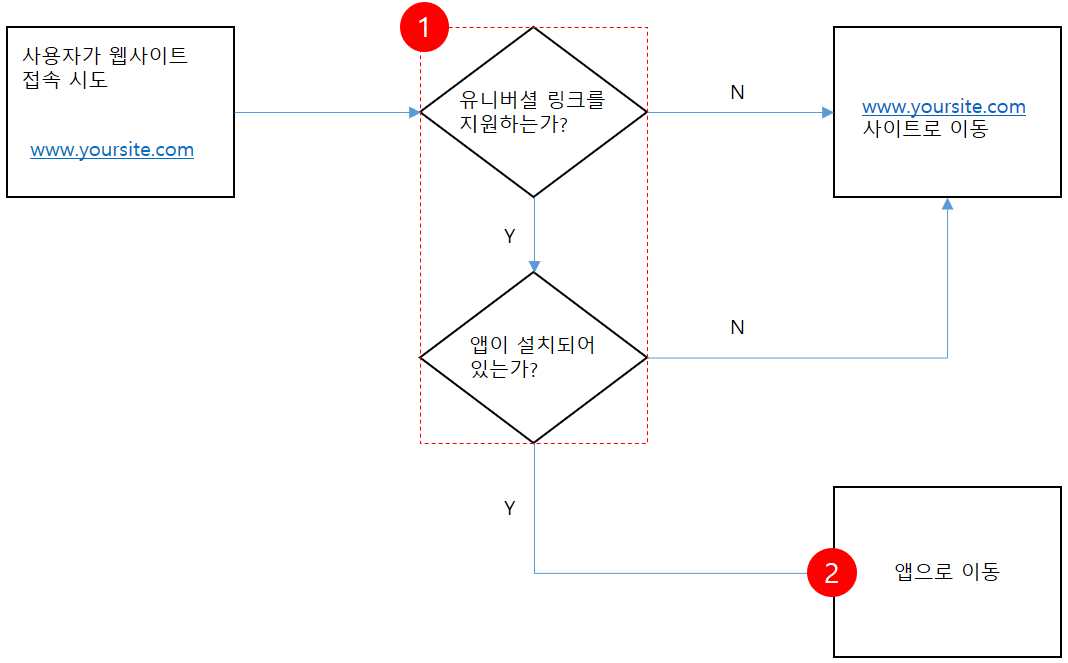 결과적으로 사용자가 브라우저에 www.yoursite.com을 입력하면 단말기에 앱이 설치되어 있는 경우는 앱이 실행되고, 앱이 없다면 www.yoursite.com 페이지가 열립니다. 아래 그림을 참고하면 이해가 쉽습니다.