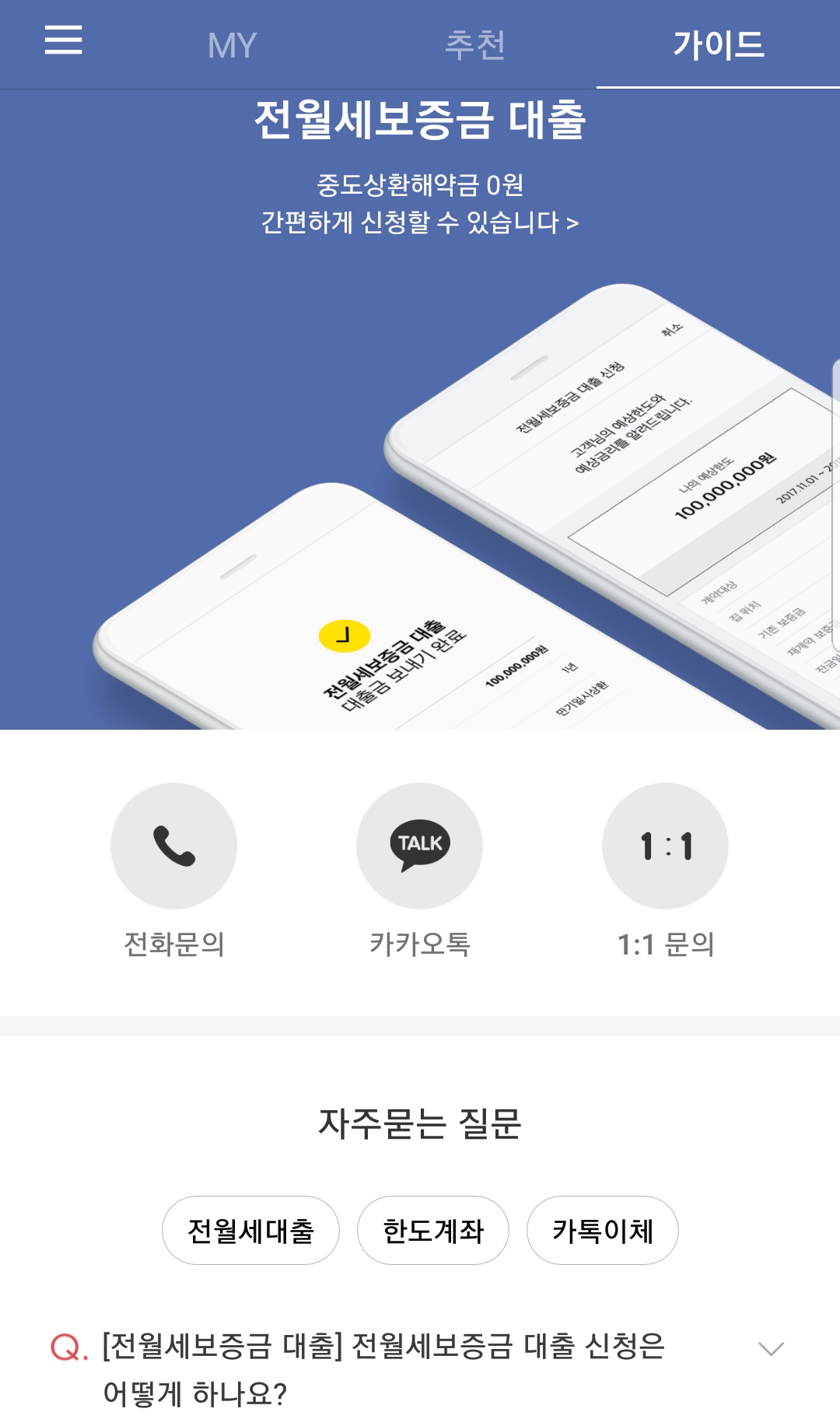 특히 직접 문의할 수 있는 세 가지 방법을 FAQ 보다 위쪽에 배치한 것이 재미있습니다. 빠른 해결이 필요하면 전화를, 급하지만 대면 채널에 대한 거부감이 있다면 실시간 카톡을, 상대적으로 여유가 있고 능숙한 사용자는 1:1 문의를 상황에 따라 선택할 수 있습니다. 되도록 빠르고 직접적으로 트러블 슈팅을 진행하려는 의지를 읽을 수 있습니다.