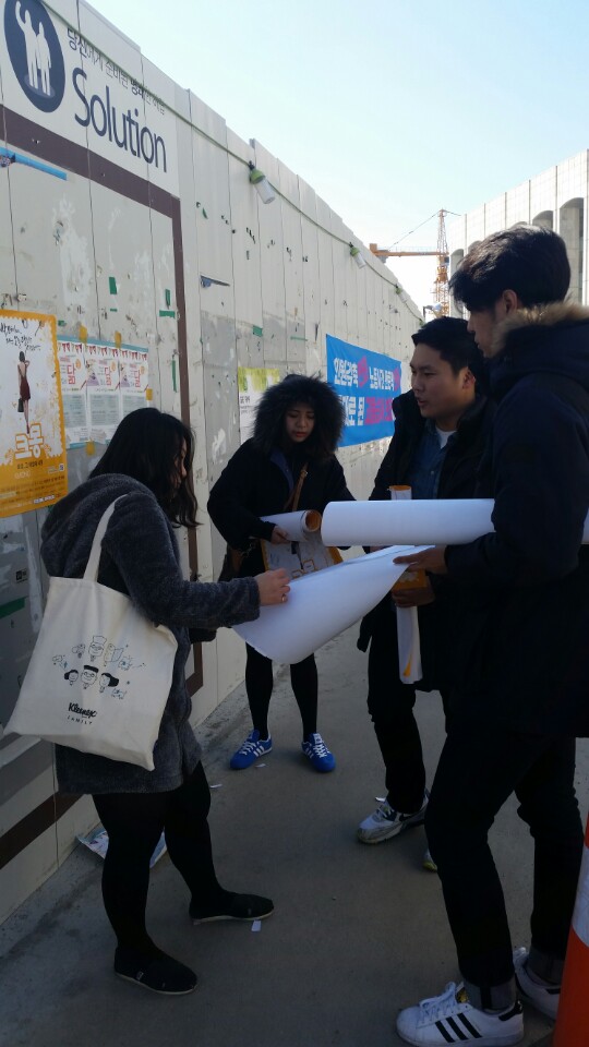 외부는 공사중이었지만 공사가림막 전체를 게시판으로 사용하고 있었어요.