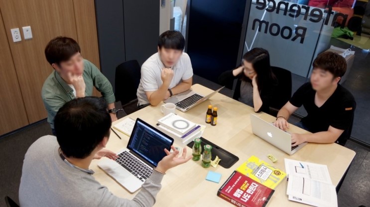 중대한 사안에 대해 다들 진지하게 회의를 하고 있는 모습인데요, 개발자님들과 마케터님들의 협업이