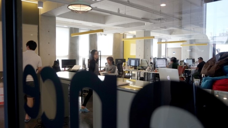 회의실에서 통유리를 통해 바라본 크몽팀 신사옥 내부 모습입니다.