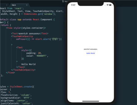 hello world기본적으로 RN은 React 기반으로 되어있기에 나는 React를 못써~ 나는 vue or angular 밖에 안 해봤어~라고 하더라도 충분히 빠르게 배울 수 있으리라 생각합니다. React나 vue나 거기서 거기 (위험한 발언이지만 둘 다 상용서비스로 사용해본 입장에선 하나 배우면 다른 라이브러리를 배우는 시간은 처음 배울 때 대비하여 절반도 안 걸렸던 것 같네요)