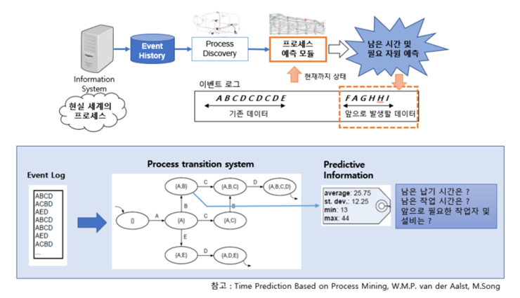 아래 그림과 같이 이벤트 로그를 기반으로 프로세스 모델을 생성하고, 수집된 패턴들과 각 분기 단계에서의 주요 성과 지표들을 디지털화하여 인공지능이 이해할 수 있는 형태로 축적합니다 이렇게 축적된 프로세스 패턴 데이터를 가지고 알파고가 최적화된 다음의 한 수를 예측하듯이 프로세스 마이닝은 인공 지능 기술과 결합하여 과거 프로세스에 대한 이해뿐만 아니라, 현재 시점에서 앞으로의 프로세스를 예측하여 합리적인 의사 결정을 도와줄 것입니다.
