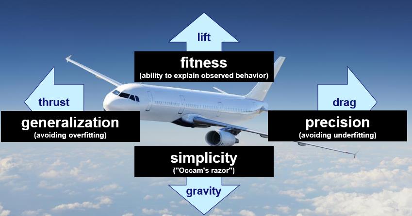 4가지 품질 특성을 보면 Fitness와 Simplicity, Generalization과 Precision은 서로 반대되는 특성을 가지고 있습니다. 즉, Fitness가 너무 높으면 Simplicity가 낮은 문제가 생기고 Generalization이 높으면 Precision이 낮은 문제가 생기게 됩니다.