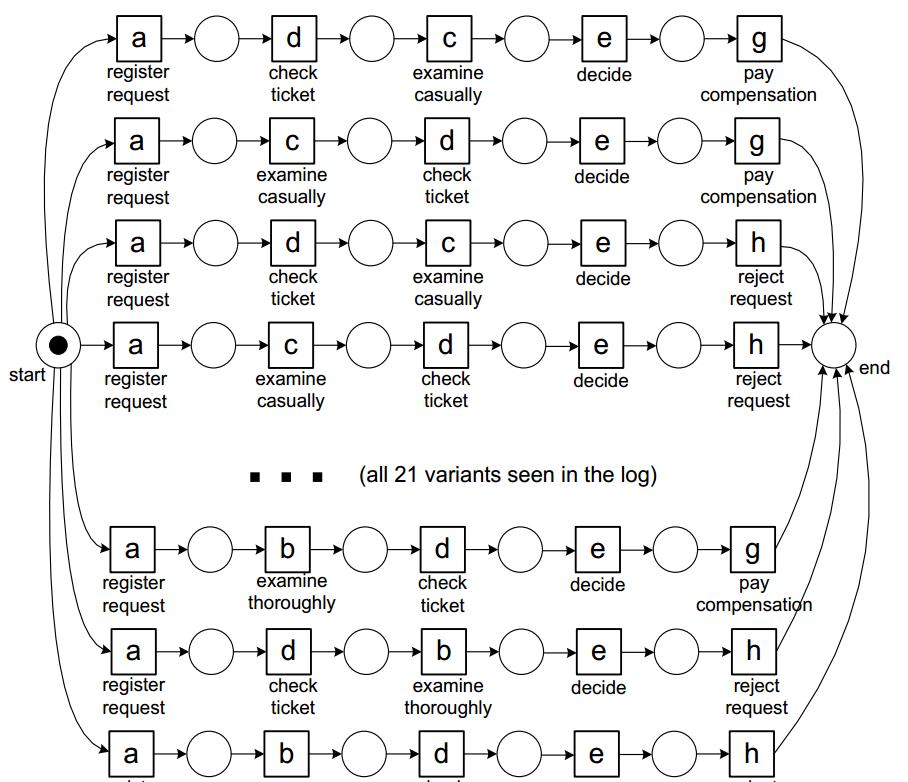 [그림 4]는 관찰된 이벤트 로그를 모두 나열한 프로세스 모델입니다. 이렇게 할 경우 모델을 도출할 때 사용한 이벤트 로그의 프로세스 패턴을 모두 나타내어 Fitness와 Precision은 만족하나 Simplicity와 Generalization은 만족하지 않습니다. Overfitting된 모델도 프로세스 모델에서 유의미한 정보를 얻을 수 없습니다.