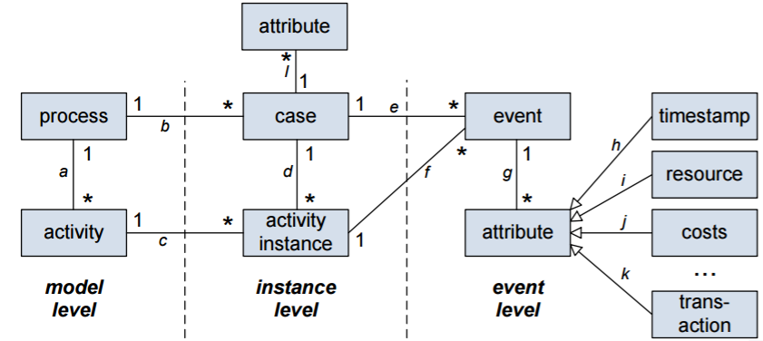 아래 그림은 프로세스 마이닝에 필요한 데이터를 설명하는 개념 모델입니다. 각각의 케이스는 이벤트로 이루어져 있고, 이벤트는 여러 속성을 가질 수 있습니다. 원본 소스로부터 이와 같은 형태의 데이터를 추출하고 변환하는 방법이 필요합니다.