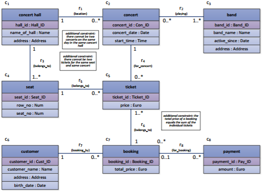 티켓 예약 데이터를 통해 데이터 추출과 이벤트 매핑을 살펴보겠습니다. 다음 그림에는 티켓, 예약, 공연, 지불, 고객과 같이 다양한 엔티티(Entity)가 있으며 이러한 엔티티는 관련된 이벤트 또는 액티비티를 가지고 있습니다.