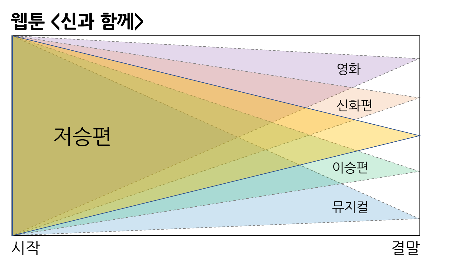 작가 혼자서 여러 형태의 이야기를 만들 수도 있습니다. 웹툰 신과 함께는 저승 편이 처음 선을 보였습니다. 하지만 그 이후엔 신화편, 이승 편이 나오면서 저승 편에서 주목받지 않았던 인물들을 다시 강조하기도 합니다. 심지어 이야기의 한 대목만을 각색해 뮤지컬로도 만들고, 주인공 김자홍의 직업을 바꿔 영화로도 만듭니다. 이야기의 형태가 바뀌니 다양한 결말을 만날 수도 있고요.