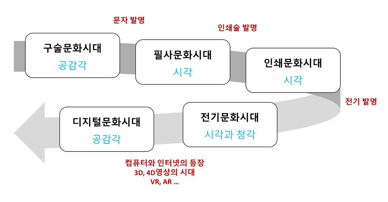 공감각의 시대가 ‘다시’ 돌아왔다는 건 옛날에도 그런 시절이 있었다는 얘기입니다. 그렇습니다. 원시 시대, 우리의 먼 조상들은 사냥에서 멧돼지를 잡은 사람의 무용담을 듣고, 알통을 만져봤습니다. 또 멧돼지의 피비린내를 맡고, 맛보기도 했죠. 그야말로 인간의 모든 감각을 유기적으로 동원하는 공감각적인 세상이었습니다. 누구나 참여하고, 감정적인 경험을 했습니다.