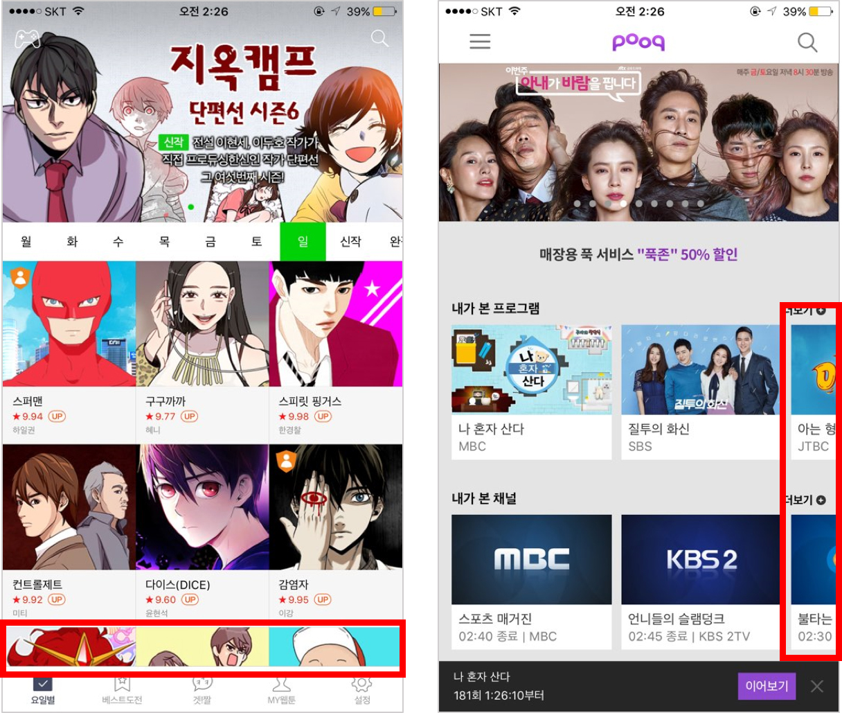 앱 화면도 종종 우리의 행동을 유도합니다. 위의 앱 화면에서 썸네일이 잘려있을 경우, 우리는 자연스럽게 손가락을 움직입니다. 그러므로 콘텐츠 크리에이터는 독자가 순서대로, 편하게 읽을 수 있도록 시각적인 힌트를 콘텐츠 안에 심어야 합니다.