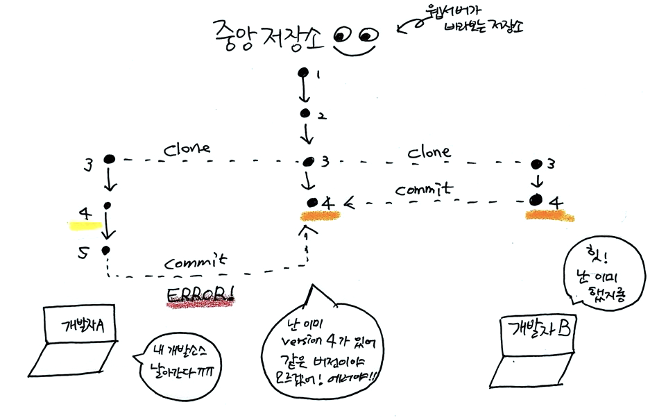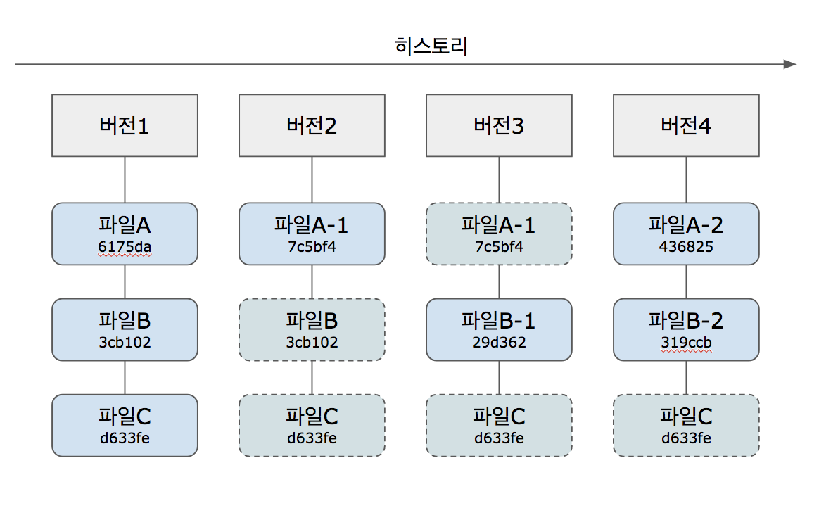 금융 프로젝트에 참여했을 때의 일입니다. VCS 중 H사 툴을 사용하였는데 한 소스의 버전을 받고 개발하는 과정에서 커밋의 횟수가 많아지니 중앙 저장소 입장에서는 ver 1 → ver 9로 갑자기 타임워프하는 일이 생겼습니다. 그래서 개발자 스스로 본인의 버전을 모두 삭제한 후 ver 9였던 파일을 수동으로 ver 2로 바꿔주는 것이 관례였습니다. 소스가 모두 날아가는 경우가 있어 소스 commit 과정이 공포스러웠죠. 깃은 해쉬(hash)를 이용한 정보 관리를 통해 이런 문제를 말끔하게 해결합니다.