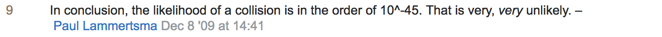 깃은 소스 코드를 포함해서 히스토리를 관리하는데 필요한 모든 정보를 이런 해쉬로 저장 및 관리합니다. 이 해쉬값은 40자리 16진수 숫자이며 SHA-1 알고리즘으로 생성됩니다. SHA-1 알고리즘은 보안 표준 해쉬 알고리즘 중 하나입니다. 충돌할 확률은 1 / 10^45로, 매우 매우 낮기 때문에 수많은 정보를 저장 및 관리하기에 안전하고 적합합니다.