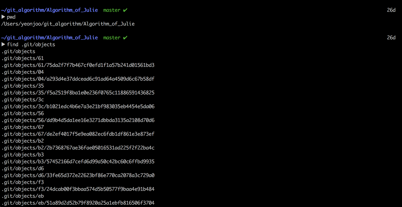 앞서 SHA-1 해쉬값으로 모든 정보를 저장한다고 말씀드렸는데, 과연 어떤 정보를 어디에, 어떻게 저장하고 있는 것일까요? 각 해쉬 값은 깃이 내부적으로 저장하는 파일 이름이 되기도 하는데, 이 파일들은 .git/objects 경로에서 전부 찾아볼 수 있습니다.