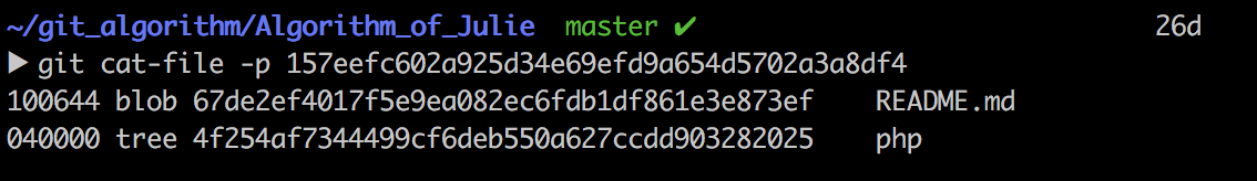 Tree Object 내부에는 프로젝트 구조의 각 디렉토리에 대한 정보가 담겨 있습니다. 하위에 어떤 폴더와 파일을 가지고 있는지 알려주고, 객체 해쉬 값을 저장하고 있습니다. 이 Tree Object의 제일 상위 객체는 root이며, 프로젝트의 최상위 폴더에 대한 정보를 담게 됩니다.