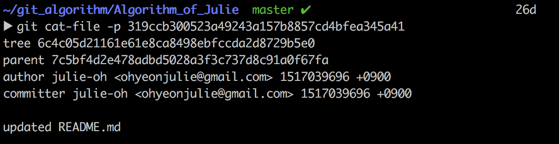 Commit Object는 커밋 시점의 Repository Root Directory의 해쉬 값을 가지고 있는 녀석입니다. Parent는 내 커밋 전에 커밋이 누구인지를 뜻하는데요. 또한, 커밋할 때의 committer(user), commit message등의 정보도 가지고 있습니다.