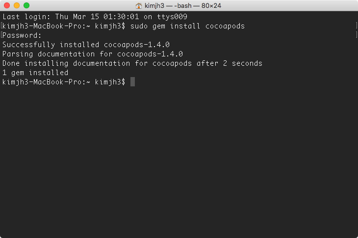 개발한 앱에 사용할 오픈소스 라이브러리를 찾았다면 코코아팟을 설치해 앱과 연결해봅시다. 먼저 코코아팟을 설치하고 터미널 프로그램을 열어 아래와 같은 명령어를 입력합니다.