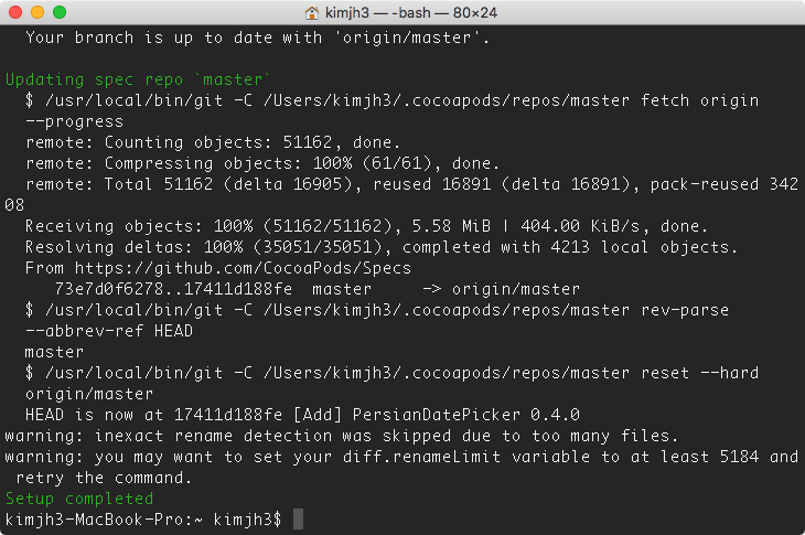 그리고 CocoaPods Master Specs repository에 있는 Podspec file를 컴퓨터에 다운로드합니다. –verbose 명령어를 이용해 현재 진행 상황을 터미널에서 볼 수 있게 합니다.