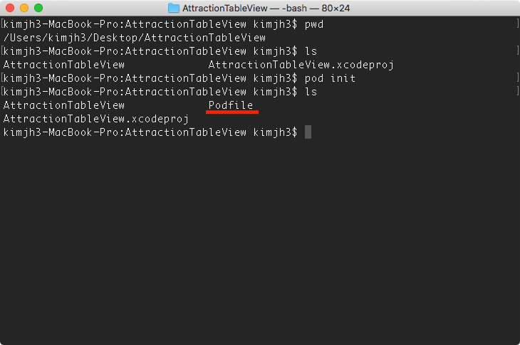 터미널 프로그램을 이용해 방금 전 만든 프로젝트 경로로 이동하고, Podfile을 만들어 앱에 필요한 라이브러리를 설정합니다. Podfile을 만드는 방법이 두 가지입니다. 첫 번째는 pod init 명령어를 이용해 코코아팟이 기본 틀이 있는 파일을 생성하게 하는 것입니다. 두 번째는 개발자가 직접 빈 파일을 만들어 설정하는 방법입니다. 이번 글에서는 pod init 명령어를 사용하겠습니다. (편리합니다.)