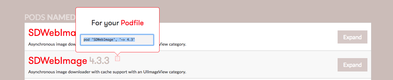 이제 Podfile을 열어 우리가 사용할 라이브러리를 세팅하고 코코아팟 공식 사이트에 접속합니다. 사용하고자 하는 라이브러리를 검색하고 이름 옆 클립보드 아이콘에 마우스 포인터를 올려보세요. Podfile에 복사할 텍스트가 나타날 겁니다. 이 텍스트를 복사하여 Podfile에 붙이고 저장합니다. 이 글에선 URL에서 가져올 이미지를 다루기 위해 SDWebImage 라이브러리를 사용하겠습니다.