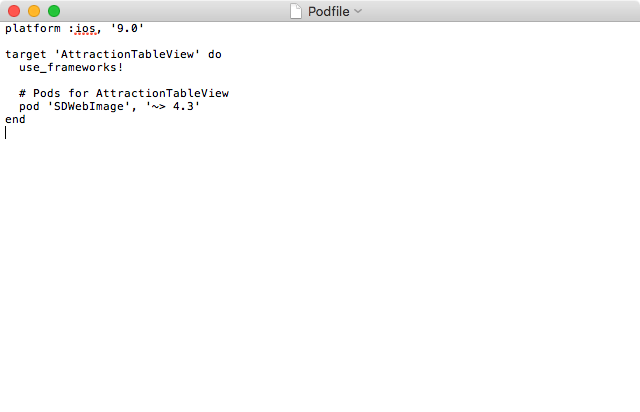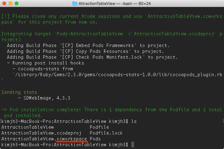 위의 Podfile을 잠시 설명하자면 프로젝트의 배포 타겟은 iOS 9.0 입니다. ‘use_frameworks!’ 은 코코아팟을 통해 프로젝트에 추가할 라이브러리가 스위프트로 작성되어 있고, 프레임워크를 사용할 것이기 때문에 꼭 추가해야 하는 문장입니다. 라이브러리 옆의 숫자는 4.3 그리고 4.4 이전까지 라이브러리 버전을 사용하겠다는 뜻 입니다. 최소한의 설정을 맞췄으니, 저장하고 다음 명령어를 실행합니다.