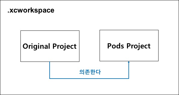 Pod 설치가 완료되면 xcworkspace 파일이 생성된 것을 확인할 수 있습니다. Xcworkspace 파일은 쉽게 말해서 프로젝트들의 컬렉션(collection of projects)입니다. 기존에 제작한 프로젝트(Original project)와 pods 프로젝트(Pods project)를 함께 묶는데, 이 pods 프로젝트 하나로 모든 라이브러리를 관리할 수 있습니다. 기존 프로젝트는 이 pods 프로젝트를 의존하기 때문에 xcodeproj 파일을 열면 연결된 라이브러리들에 대한 정보가 없어서(혹은 발견하지 못해서) Xcode 프로그램이 에러를 발생시킵니다. 그러므로 코코아팟으로 pod을 설치했을 때, 프로젝트는 xcworkspace 파일을 열어 개발해야 연결한 라이브러리들을 잘 사용할 수 있습니다.