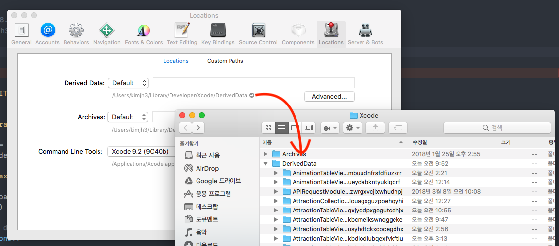 우선 위의 폴더 경로를 먼저 찾아 Finder로 여세요. 그 다음에 Xcode를 종료해 안전하게 삭제해야 합니다.