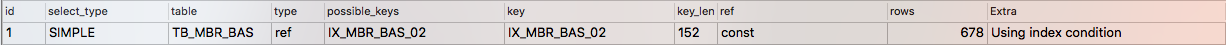 위의 이미지는 임의로 만든 자료를 이용해 Query를 실행한 결과입니다. 실행 계획은 TABLE : TB_MBR_BAS 를 TYPE : ALL 전체 검색한다고 나옵니다. 실행한 내용도 같습니다. 여기서 MBR_NM 이 “나서영”인 자료를 검색해볼까요.
