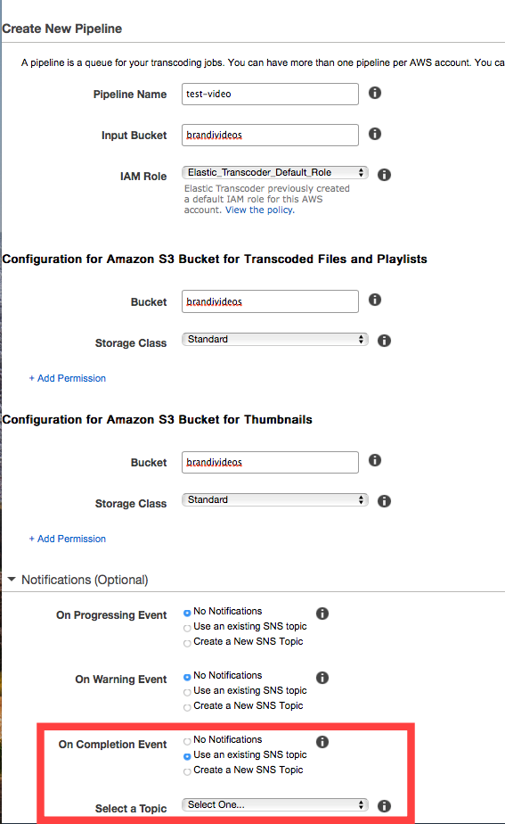 Optional 항목인 Notification 영역에서 상태별 이벤트를 설정할 수 있습니다. On Completion Event에 위에서 생성한 Topic을 선택해 이벤트를 전달받도록 설정합니다.