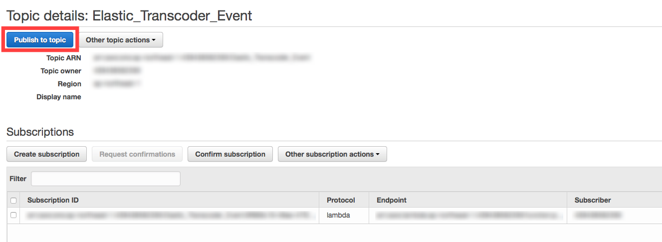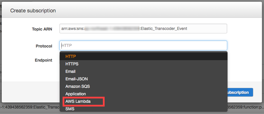 트랜스 코딩이 완료 후 처리할 프로세스를 가진 Lambda 함수 생성하여 위에서 생성한 SNS Topic에 구독자로 등록합니다. 현재 SNS Topic에서 제공하는 프로토콜은 HTTP, HTTPS, Email, Email-JSON, Amazon SQS, Application, AWS Lambda, SMS가 있습니다.