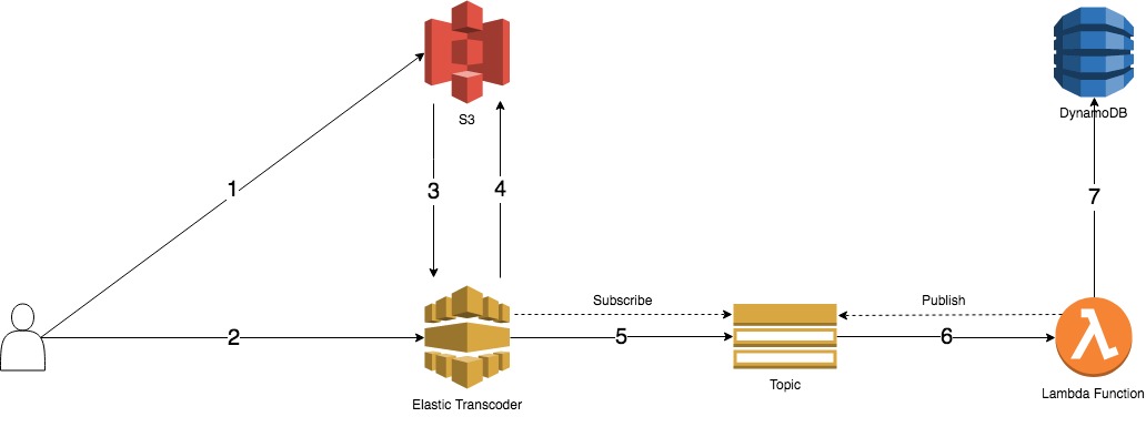 위의 그림과 같이 구독자는 게시자 서비스에서 트리거된 이벤트에 응답해 필요한 작업을 진행합니다. 예시로 Elastic Transcoder 서비스에서의 Topic을 활용해보겠습니다. 네 가지의 순서를 거칩니다.