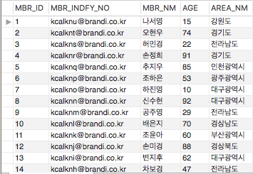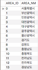 AREA_NM 컬럼을 추가해 지역이 나오도록 했습니다. AREA_NM을 보면 중복되는 지역명이 있습니다. 이럴 때 보통 AREA_NM을 별도의 테이블을 만들어 ID OR 코드를 부여해 처리합니다. 위의 UPDATE 문을 참조하여 ID를 만들면 아래와 같이 만들 수 있습니다.