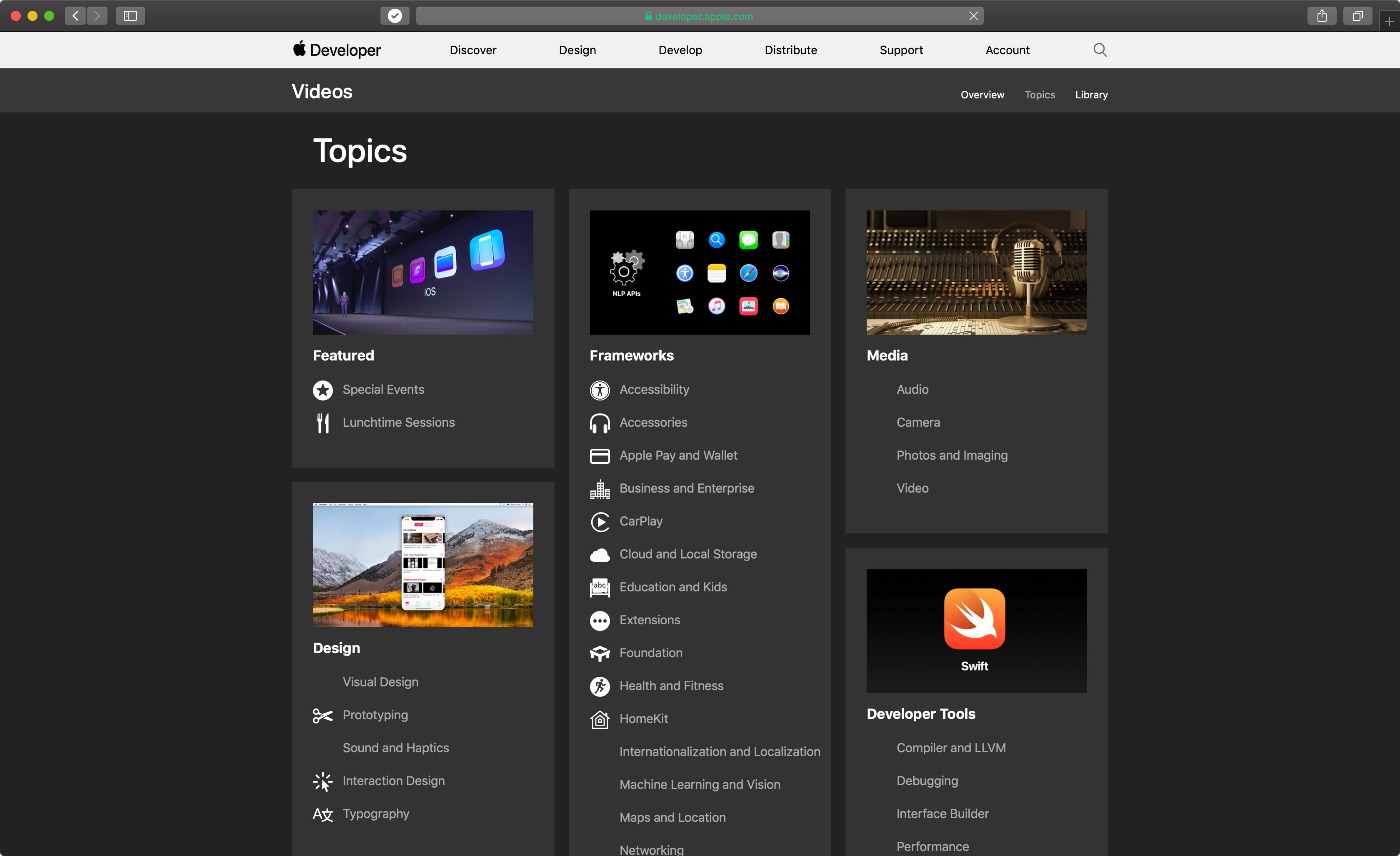 애플 관련 애플리케이션 개발자는 문제에 부딪히면 Apple Developer 웹사이트에서 도움을 얻는데요. 특히 Development Videos 사이트에 들어가면 그해 발표한 WWDC 세션부터 시작해서 그 동안의 세션들을 모두 볼 수 있습니다. Topics에서는 주제별로 카테고리를 만들어, 해당 주제에 관한 동영상들을 모아서 볼 수 있고, Library에서는 찾고자 하는 내용에 대한 키워드를 검색해서 찾을 수 있습니다.
