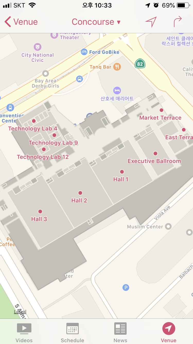WWDC 행사장은 Hall 1 ~ Hall 3, 그리고 Executive Ballroom까지 4개의 방으로 구성되어 있었습니다. 이곳에서 각각의 세션을 들을 수 있었는데요. 시간대별로 3~4개의 세션을 동시에 진행합니다. 듣고 싶은 세션은 해당하는 방에 들어가서 들으면 됩니다. 만약 같은 시간에 듣고 싶은 세션이 두 개 이상이라면 하나만 현장에서 듣고, 다른 세션은 developer 웹사이트 또는 WWDC 앱에서 업로드되길 기다려야겠죠. 물론 24시간이 지나면 세션 영상이 WWDC앱에 업로드됩니다.