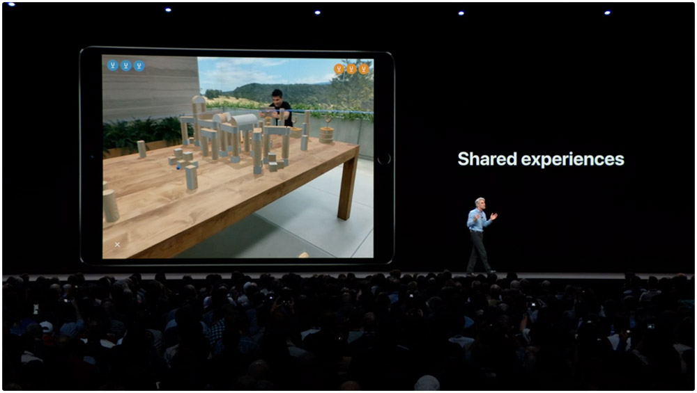 지금부터는 인상 깊었던 세션 세 가지를 소개하겠습니다. 첫 번째는 What’s new in ARTKit 2였습니다. 이 세션이 가장 인상 깊었던 이유는 애플이 AR에 중점을 두고 있다는 생각이 들었기 때문입니다. 실제로 Keynote 발표 중에 장난감용 블럭을 만드는 회사 관계자 두명이 AR을 활용한 앱을 실행해 노는 모습을 보여주기도 했습니다.