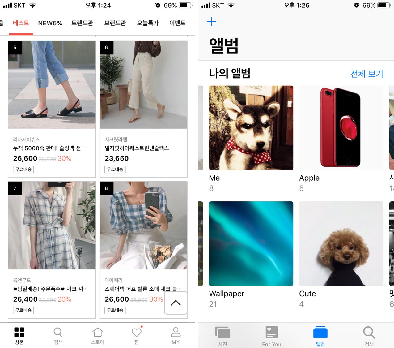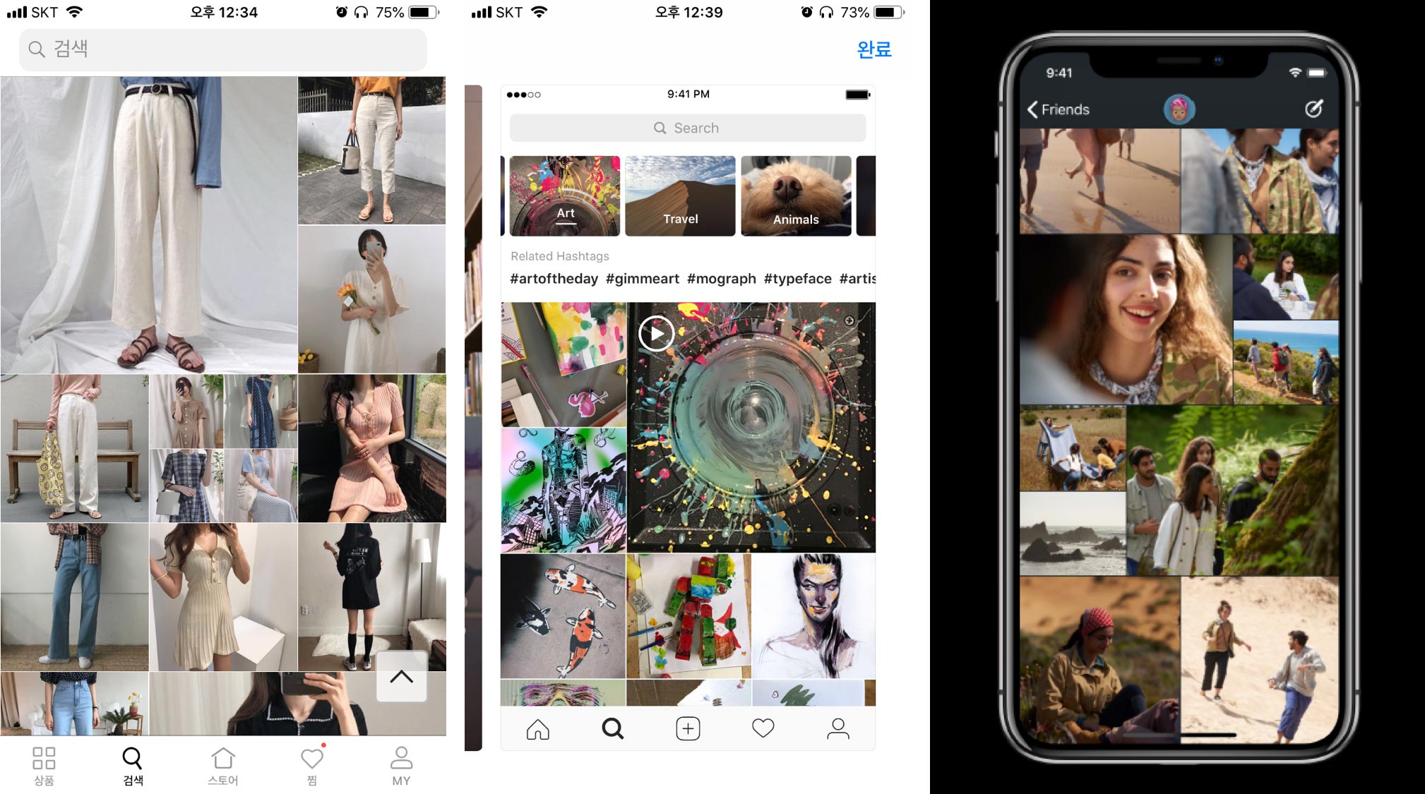 Line-based 레이아웃이 아닌 다른 모습의 레이아웃이라면 어떤게 있을까요? 세션에서 예를 든 레이아웃이 바로 모자이크 레이아웃이였습니다. 브랜디 앱, 또는 다른 앱에서 볼 수 있는 모자이크 레이아웃은 일직선상에서 일렬로 정렬하지 않고, 그리드 레이아웃과 조금 다른 모습입니다. 아래의 스크린샷을 보면 어떤 레이아웃인지 감이 잡힐 겁니다.