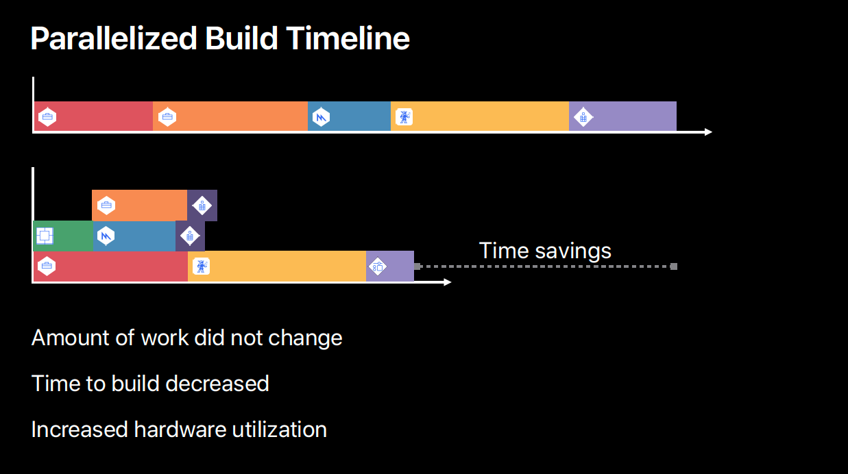 프로젝트 세팅과 가독성 있는 코드 작성, 이 두 가지가 빌드 타임과 관련되어 있었습니다. Xcode는 프로젝트를 구성(configure)할 때, 빌드할 targets(iOS App, Framework, Unit Tests 등)와 targets 사이의 종속 관계(dependency)를 따릅니다. Dependency에 따라서 target을 빌드하는 순서도 정해지는데, 순서대로 빌드하지 않고 최소한의 연결을 유지하면서 병렬적으로 빌드하게 됩니다.