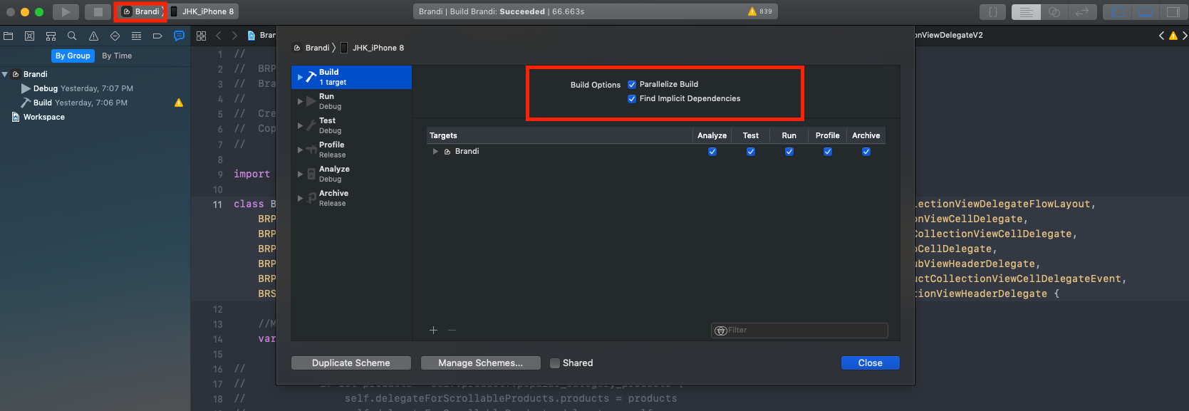 이것은 Xcode 10에서 Scheme Editor에서 설정할 수 있습니다. 프로젝트의 Target → Edit Scheme → Build → Build Options에서 Parallelize Build를 체크하면 됩니다.