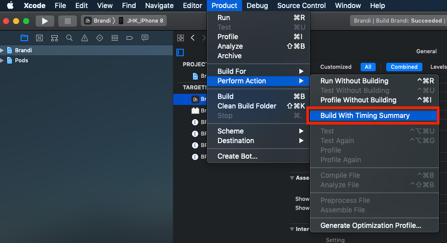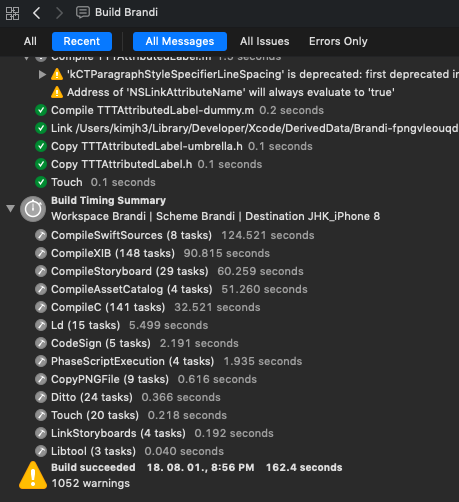 또한 Xcode 10에는 빌드 타임을 계산하는 기능도 있습니다. 빌드할 때 어떤 부분에서 얼마나 걸렸는지 요약해서 보여주는 기능도 있습니다. Product → Perform Action → Build With Timing Summary를 선택하면 빌드 후 요약해서 Xcode에 나타납니다.