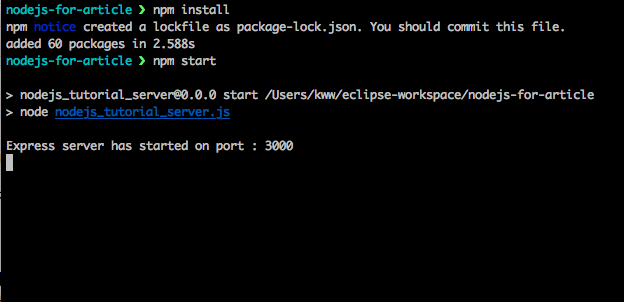 nodejs_tutorial_server.js 파일을 메인으로 실행합니다. HTTP Request를 처리하려면 express를 사용해야 하며, 서버를 구분하려면 uuid모듈이 필요합니다.