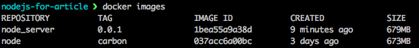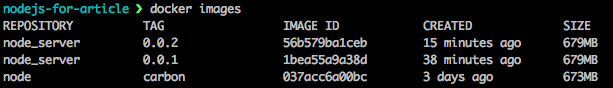 NodeJS Carbon 이미지를 기반으로 한 node_server 이미지를 제작했습니다. 사이즈는 둘이 합쳐 1Gb가 넘을 것 같지만 실제로는 변경된 부분만 저장됩니다. 그러므로 node_server 이미지의 크기는 6~10Mb 정도입니다.