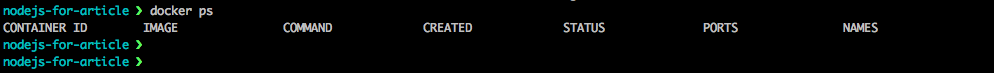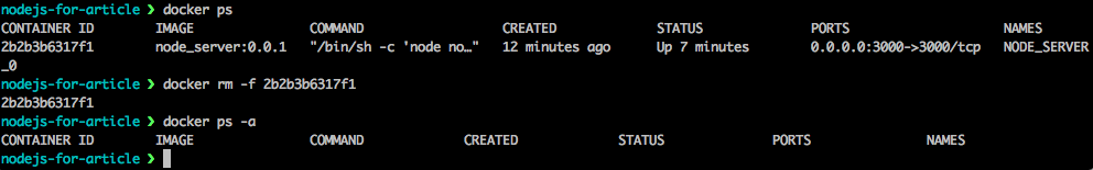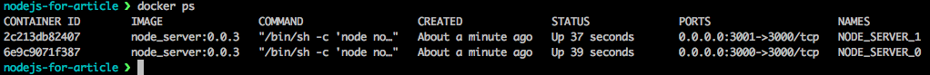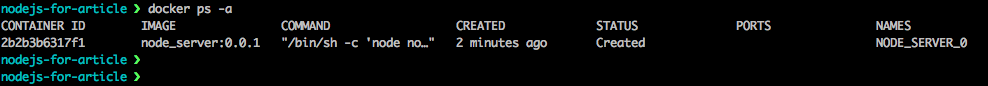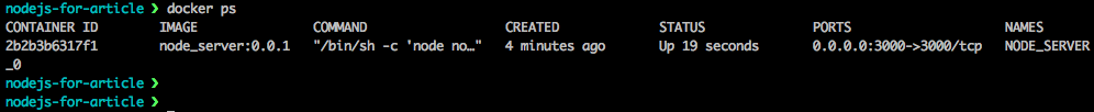 docker ps 명령어는 현재 실행 중(STATUS:Up)인 컨테이너의 목록을 보여줍니다. -a 옵션은 실행하지 않는 모든 컨테이너를 보여줍니다. 위의 이미지에서 node_server:0.0.1이미지로부터 NODE_SERVER_0 이라는 이름으로 2분 전에 생성되었다는 걸 알 수 있습니다. 3)