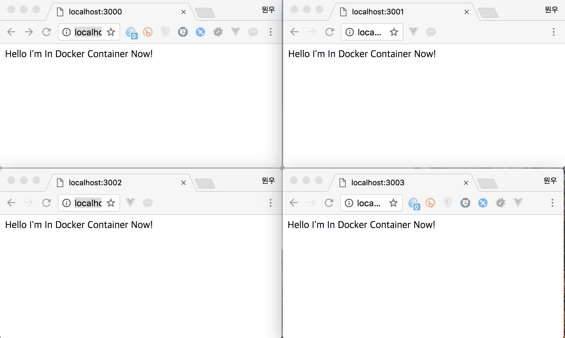 포트번호는 같은 포트를 쓸 수 없기 때문에 3001, 3002, 3003으로 매핑합니다. 브라우저로 접속해서 확인해보겠습니다.