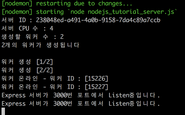 } else if(cluster.isWorker) { var express = require('express'); var app = express(); var worker_id = cluster.worker.id; var server = app.listen(port, function () { console.log("Express 서버가 " + server.address().port + "번 포트에서 Listen중입니다."); }); app.get('/', function (req, res) { res.send('안녕하세요 저는