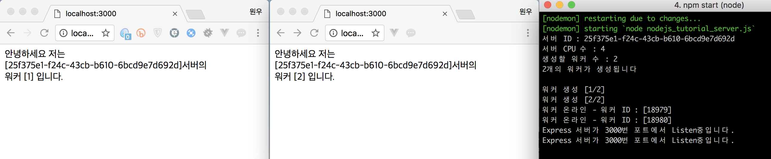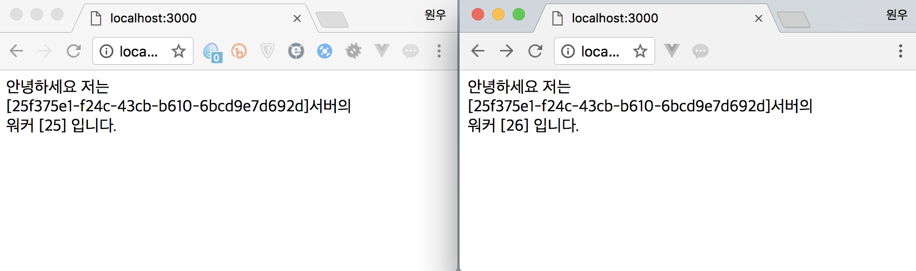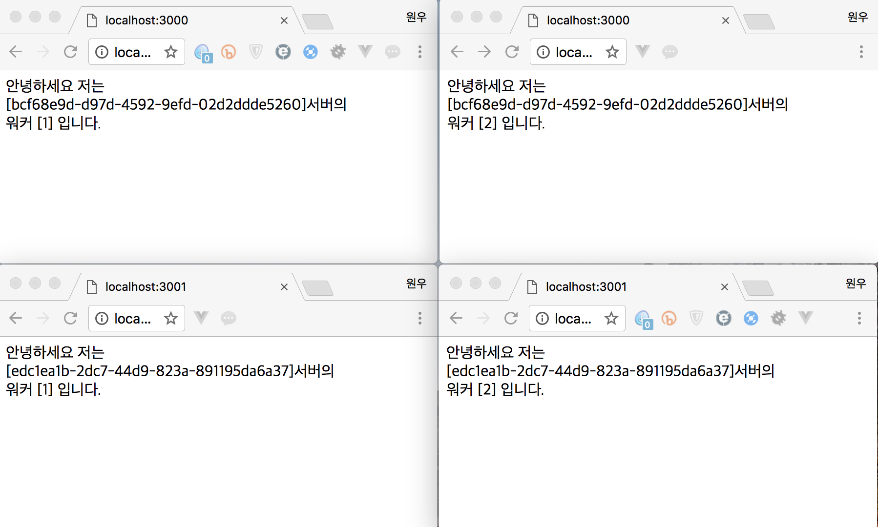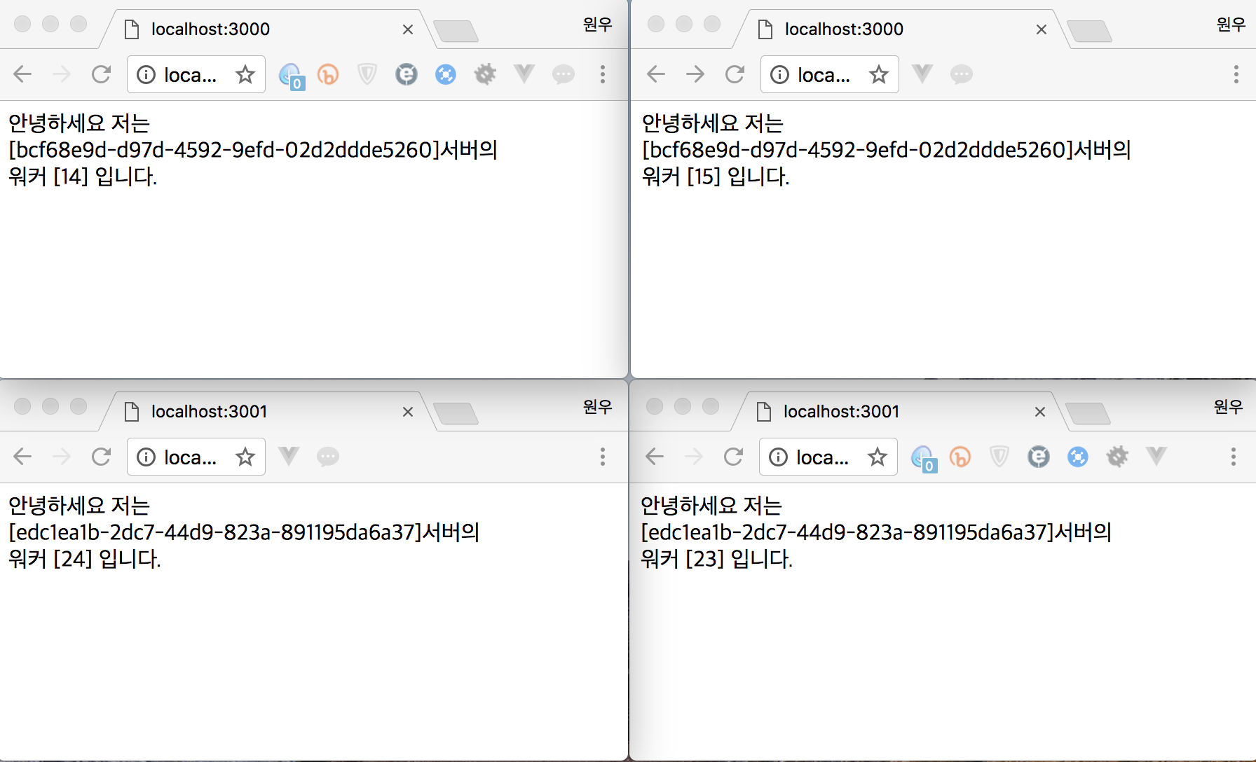똑같은 localhost:3000번 접속이지만 워커의 번호가 다릅니다.